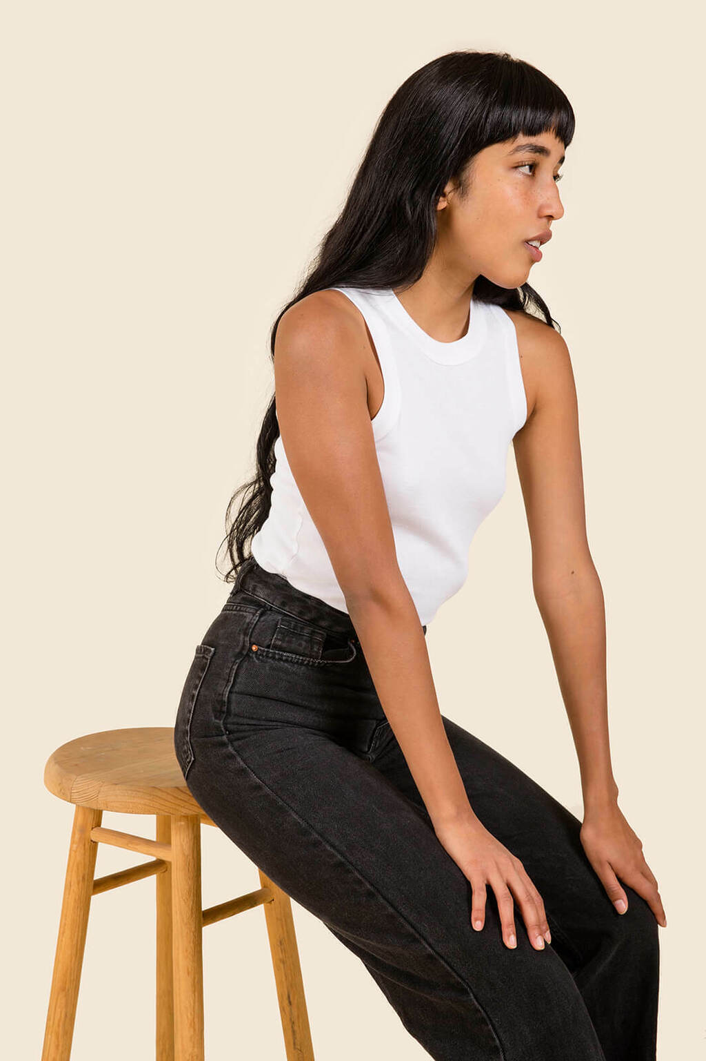 Camiseta sin mangas tipo tank top con cuello cerrado. Corte pegado al cuerpo. Tela rib que le da mayor elasticidad