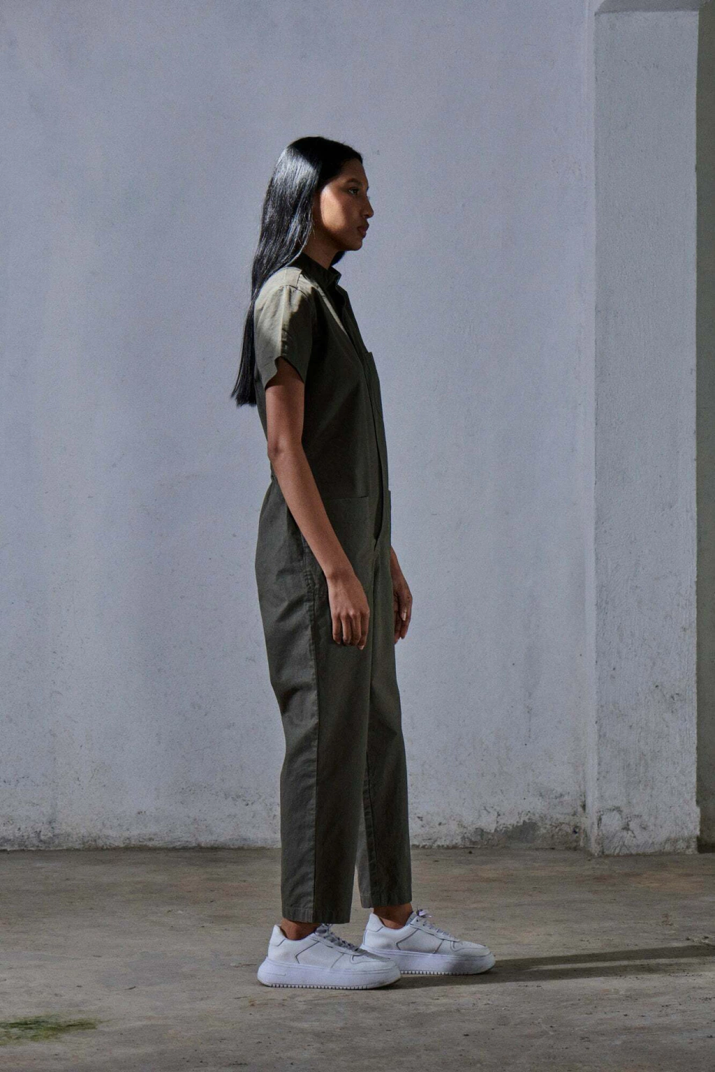 Overol verde olivo con cierre, manga corta y cuello mao. Tela ligera con un corte relajado, pierna recta, altura al tobillo. Resorte en la espalda al a altura de la cintura.